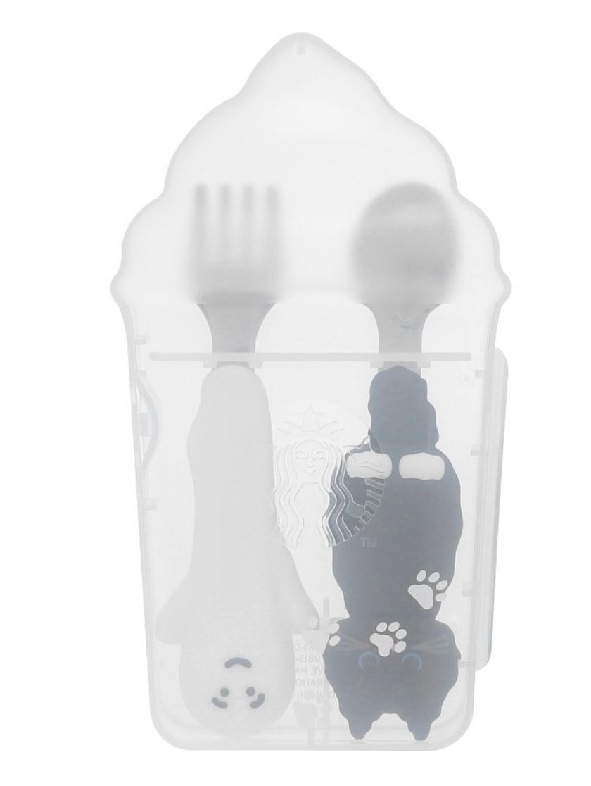 ¡Comer nunca fue tan adorable! 👻🐾 Este set de cubiertos inspirado en Halloween incluye una cuchara y un tenedor con mangos decorados con un fantasmita blanco y un gatito negro — los protagonistas de la colección Starbucks Japan 🎃✨.